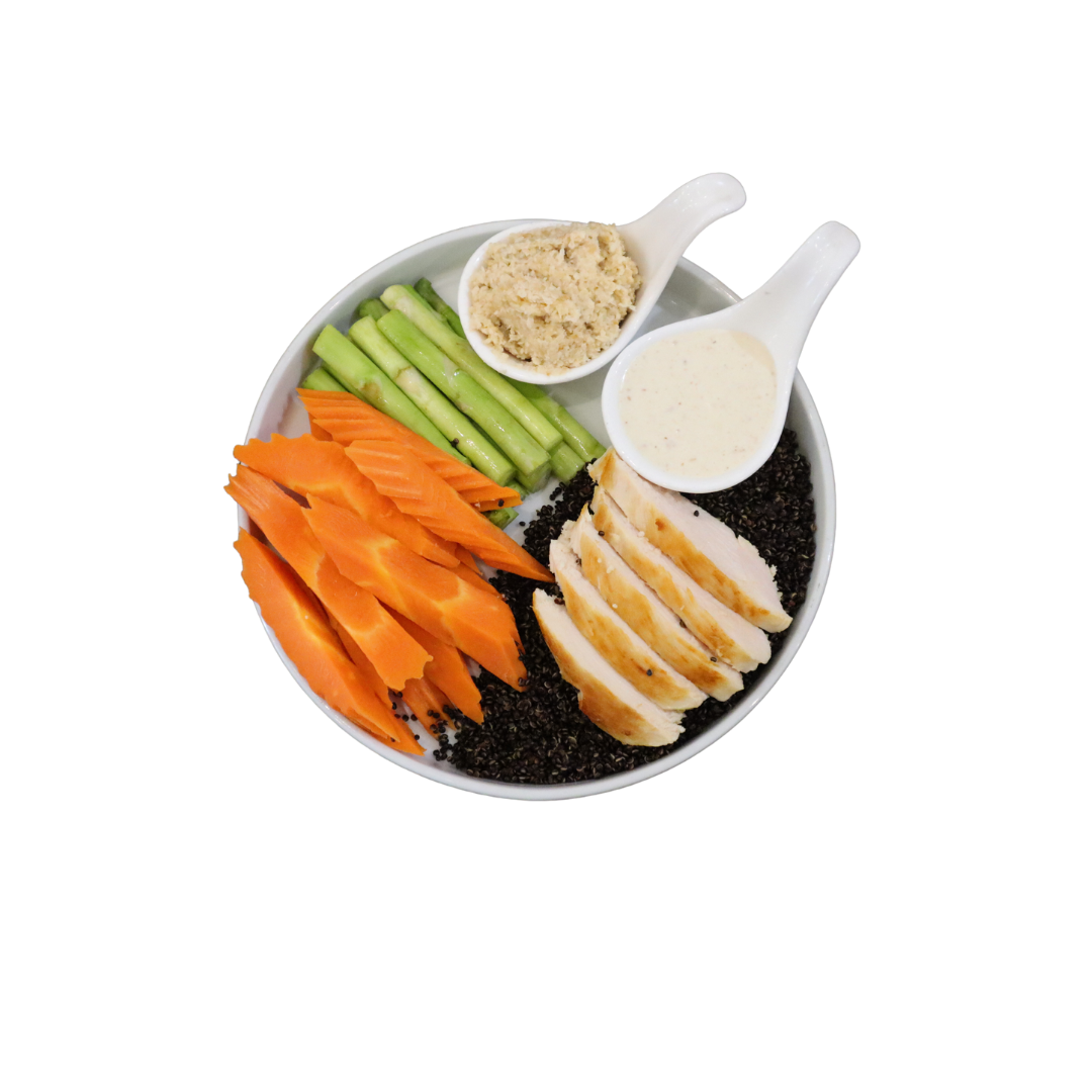 Grilled Chicken over Quinoa with Asparagus, Carrots & FG Hummus accompanied by FG Garlic Sauce